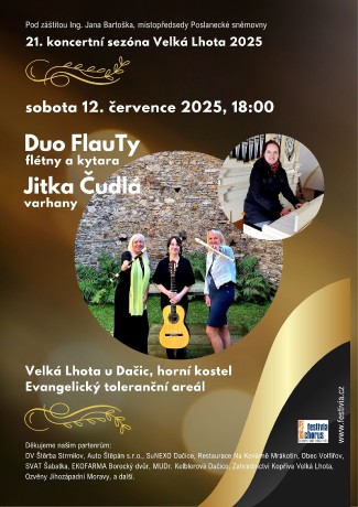 21. koncertní sezónu Velká Lhota 2025 podpořil svou záštitou Ing. Jan Bartošek, poslanec a místopředseda Parlamentu ČR. Děkujeme všem našim partnerům a sponzorům: DV Štěrba Strmilov - výroba ekobriket, Auto Štěpán s.r.o. Dačice, SuNEXO Dačice - reklamní agentura, Restaurace Na Kovárně Mrákotín, Obec Volfířov, SVAT Šabatka Dačice, MUDr. Kelblerová - praktická lékařka Dačice, EKOFARMA Borecký dvůr, Zahradnictví Kopřiva Velká Lhota, Ozvěny Jihozápadní Moravy, a další.